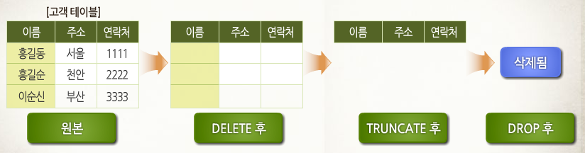 3. DROP은 테이블의 데이터, 공간, 객체 모두 삭제하며, 삭제후 절대 되돌릴 수 없다.