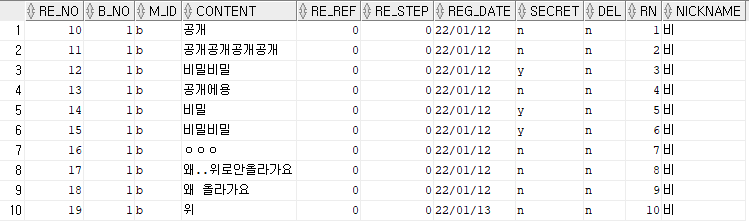 select * from (select a.*, rowNum rn, nickname from(select * from reply where del='n' order by re_no desc )a ,member m where a.m_id = m.m_id );