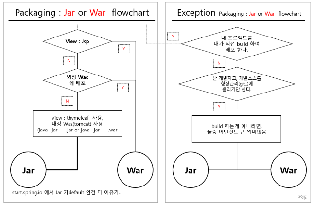 - thymeleaf사용, 내장 Was ( 내장톰캣 ) => 스프링부트 환경 => Jar 를 사용했던 것.