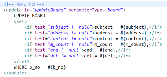 - <set> 안 조건식이 참이면 SET절을 만들어 반환하고, 거짓이면 만들지 않는다.