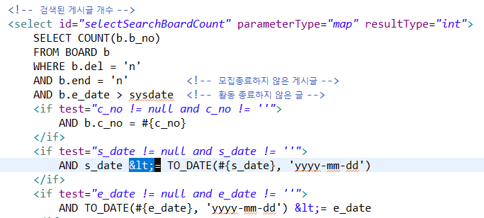 - 마이바티스에 부등호가 존재하는 쿼리를 옮겨 사용 시 오류가 발생하는 경우가 있다.