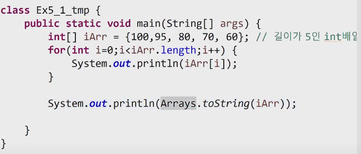 배열을 출력할 때는 System.out.println ( iArr ); 이 방식으로는 불가해서 ( 예외로 char형 배열은 가능 )
