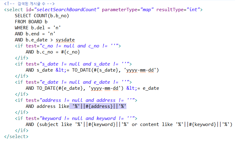 '%'를 앞 뒤로 붙여주어 해당 adress와 keyword가 포함만 되어있으면 조회가 되게 하였고 %와 adress, keyword를 연결 시켜주기 위해 || 을 사용하였다.