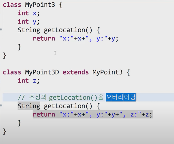 오버라이딩 : 상속받은 조상의 메서드를 자신에 맞게 변경하는 것