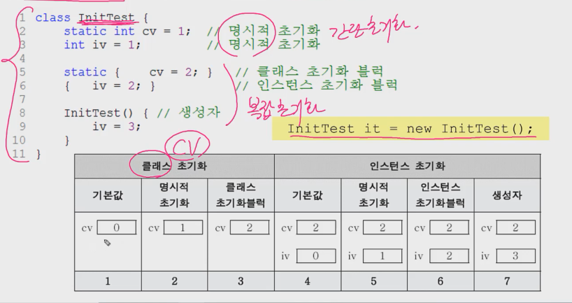 클래스 변수 초기화 시점 : 클래스가 처음 로딩될 때 단 한번