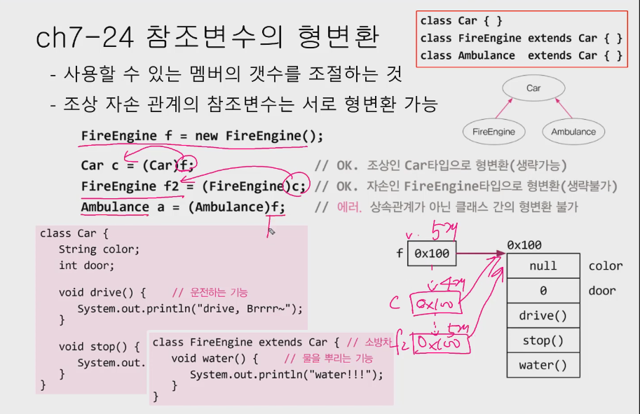 참조변수 c 에 f를 대입하였는데 둘의 타입이 다르므로 참조변수 f에 (Car) f 로 형변환을 해주어야한다.