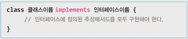 인터페이스 상속은 implements 를 쓴다. ( 뜻은 구현 )