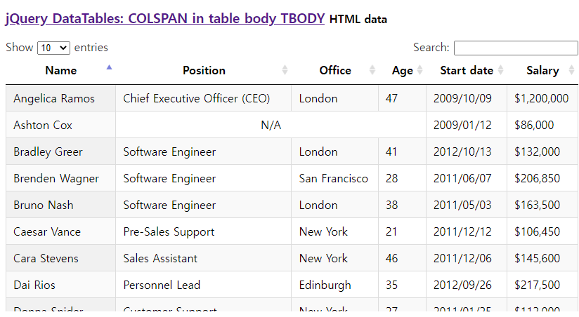 var table = $('#example').DataTable({ ajax: 'https://gyrocode.github.io/files/jquery-datatables/arrays.json', createdRow: function(row, data, dataIndex){ // If name is "Ashton Cox" if(data[0] === 'Ashton Cox'){ // Add COLSPAN attribute $('td:eq(1)', row).attr('colspan', 3); // Hide required number of columns // next to the cell with COLSPAN attribute $('td:eq(2)', row).css('display', 'none'); $(..